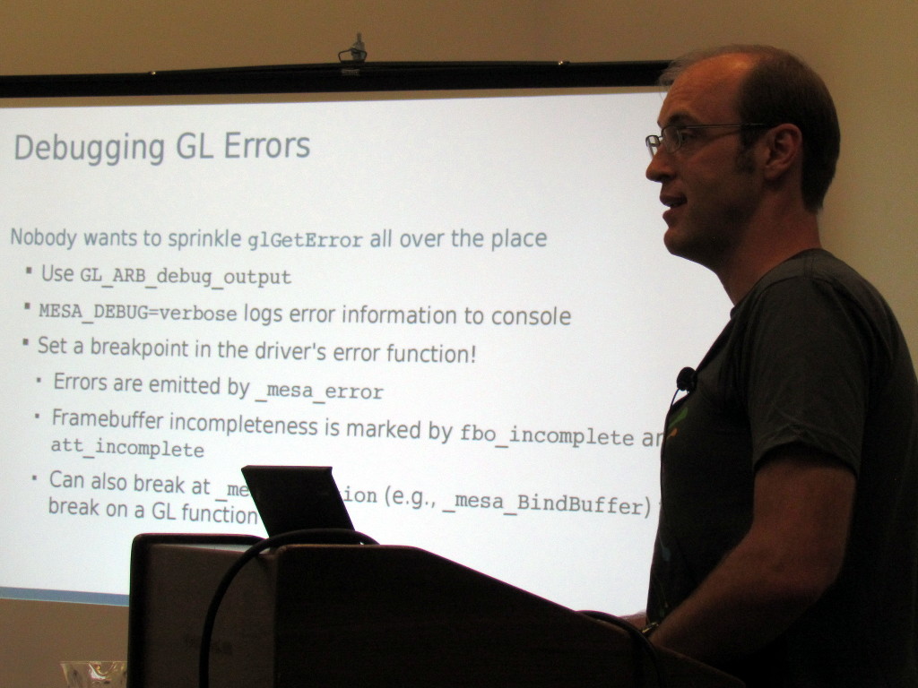 The presentation was a brief overview of performance tuning graphics applications... games... for the open-source driver on Intel's GPUs. This is a collection of tips and suggestions that my team has gathered from tuning our driver for shipping apps and working with ISVs like Valve. I'm already working to improve the slide set, and I'm hoping to present something similar at GDC. We'll see how that turns out.